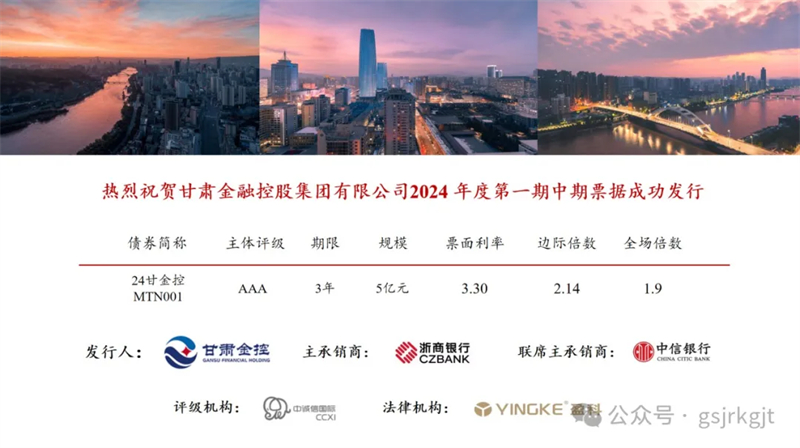 2024年3月28日,甘肅金融控股集團(tuán)有限公司成功發(fā)行2024年度第一期中期票據(jù),發(fā)行規(guī)模5億元,債券期限三年,票面利率3.3%,債券票面利率創(chuàng)集團(tuán)近三年同品種債券利率新低。