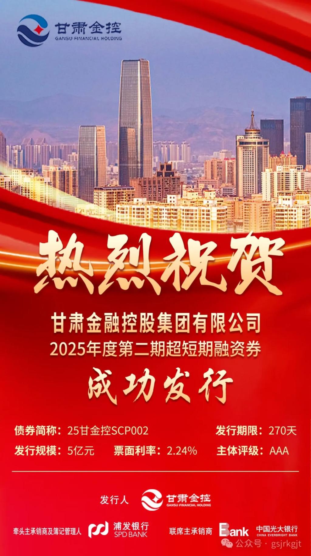 2月24日,甘肅金控集團成功發(fā)行2025年度第二期超短期融資券,規(guī)模5億元,期限270天,票面利率2.24%。甘肅金控集團始終秉持穩(wěn)健經(jīng)營理念,持續(xù)提升核心競爭力,此次債券的成功發(fā)行,充分體現(xiàn)了市場對集團信用資質(zhì)和發(fā)展前景的信心。