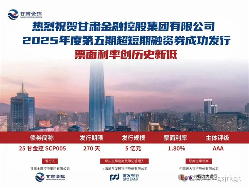 2025年11月17日,甘肅金控集團成功發(fā)行2025年度第五期超短期融資券,發(fā)行規(guī)模5億元,期限270天,票面利率1.8%,創(chuàng)下集團自開展債券融資業(yè)務(wù)以來所有債券品類中的歷史最低利率紀錄,融資成本管控成效顯著。此次低利率超短期融資券的成功發(fā)行,體現(xiàn)了資本市場對甘肅金控集團經(jīng)營實力、信用資質(zhì)及發(fā)展前景的高度認可,為其后續(xù)支持省內(nèi)實體經(jīng)濟發(fā)展、深化金融服務(wù)創(chuàng)新、防范化解金融風險等工作提供更充足的資金保障,助力集團在服務(wù)全省經(jīng)濟社會高質(zhì)量發(fā)展中發(fā)揮更大作用。