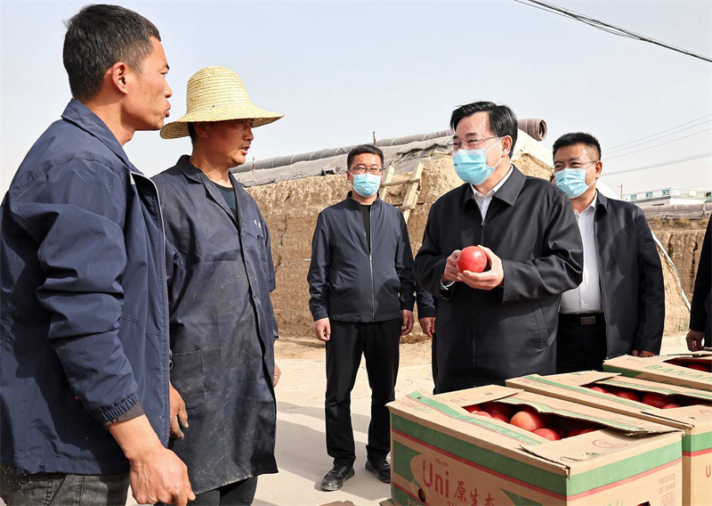 在白銀區(qū)武川鄉(xiāng)紅峴村、靖遠(yuǎn)縣東灣現(xiàn)代農(nóng)業(yè)產(chǎn)業(yè)園,胡昌升走進(jìn)田間地頭、蔬菜大棚,與正在勞作的群眾親切交流,詳細(xì)詢問春耕生產(chǎn)、鄉(xiāng)村振興等情況。他強(qiáng)調(diào),要做好農(nóng)資農(nóng)機(jī)服務(wù)保障,加強(qiáng)農(nóng)業(yè)技術(shù)指導(dǎo),全力抓好春耕生產(chǎn)。要善于挖掘和利用本地優(yōu)勢資源發(fā)展特色富民產(chǎn)業(yè),培育壯大新型農(nóng)業(yè)經(jīng)營主體,提升組織化集約化水平,促進(jìn)農(nóng)業(yè)增產(chǎn)增效、農(nóng)民增收致富。要落實五級書記抓鄉(xiāng)村振興要求,發(fā)揮好基層黨組織和黨員干部作用,更好組織群眾、宣傳群眾、凝聚群眾、服務(wù)群眾,緊緊圍繞促進(jìn)農(nóng)民增收這個中心任務(wù),把黨組織建在產(chǎn)業(yè)鏈上,把黨員聚在產(chǎn)業(yè)鏈上,讓群眾富在產(chǎn)業(yè)鏈上,把黨的組織優(yōu)勢轉(zhuǎn)化為加快鄉(xiāng)村發(fā)展的實際成效。