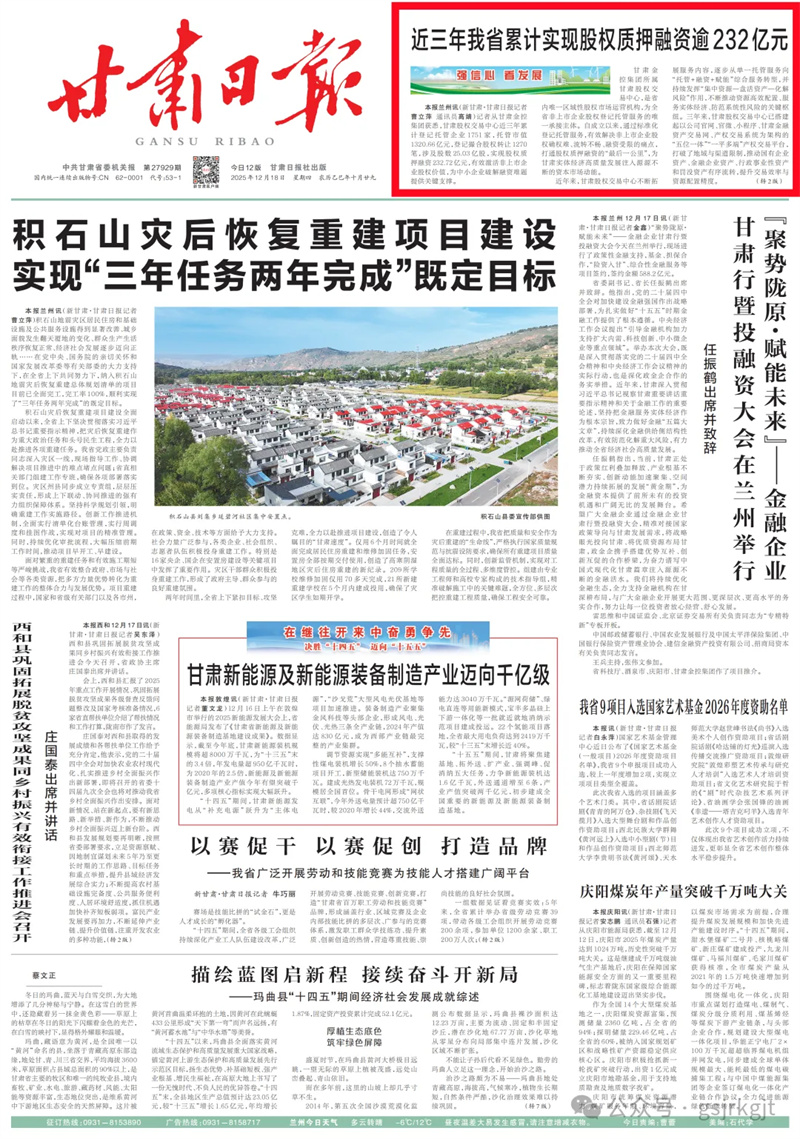 (新甘肅客戶端蘭州訊(新甘肅·甘肅日報記者曹立萍 通訊員高婧)記者從甘肅金控集團(tuán)獲悉,甘肅股權(quán)交易中心近三年累計登記托管企業(yè)1751家,托管市值1320.66億元,登記撮合股權(quán)轉(zhuǎn)讓1270筆,涉及股數(shù)25.03億股,實(shí)現(xiàn)股權(quán)質(zhì)押融資232.72億元,有效激活非上市企業(yè)股權(quán)價值,為中小企業(yè)破解融資難題提供關(guān)鍵支撐。