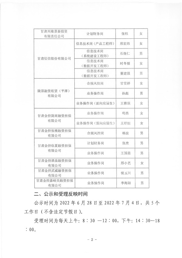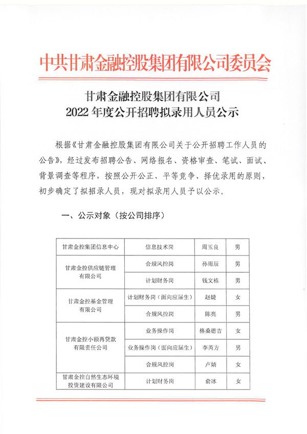 甘肅金融控股集團有限公司2022年度公開招聘擬錄用人員公示