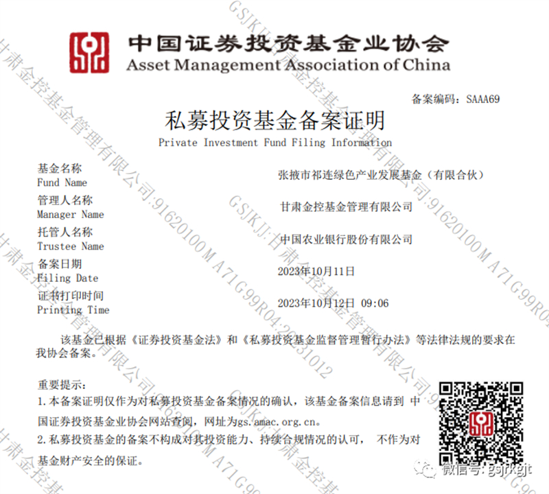 近日,張掖市祁連綠色產(chǎn)業(yè)發(fā)展基金(有限合伙)在中國證券基金業(yè)協(xié)會備案。該基金備案時正逢《私募投資基金監(jiān)督管理條例》頒布實施,金控基金公司充分研究新規(guī)要求,并做足備案前的準(zhǔn)備工作,為順利通過基金備案奠定了基礎(chǔ)。