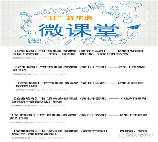 為保證培育任務(wù)不停擺、不斷檔,甘肅股權(quán)交易中心持續(xù)推進(jìn)培訓(xùn)工作,開(kāi)辟線上培訓(xùn)、講座新路徑。第一季度已累計(jì)舉辦線上培訓(xùn)講座18場(chǎng),培育667人次。一方面通過(guò)“甘”貨來(lái)襲·微課堂開(kāi)展上市融資、專精特新政策導(dǎo)向等方面解讀,精準(zhǔn)解答中小企業(yè)發(fā)展中遇到的困惑;另一方面利用科融通云講堂系列培訓(xùn)課程及心流慧估“專精特新”企業(yè)服務(wù)系列培訓(xùn)課程,深入剖析新階段行業(yè)趨勢(shì)和機(jī)遇,助力企業(yè)長(zhǎng)期高速發(fā)展。