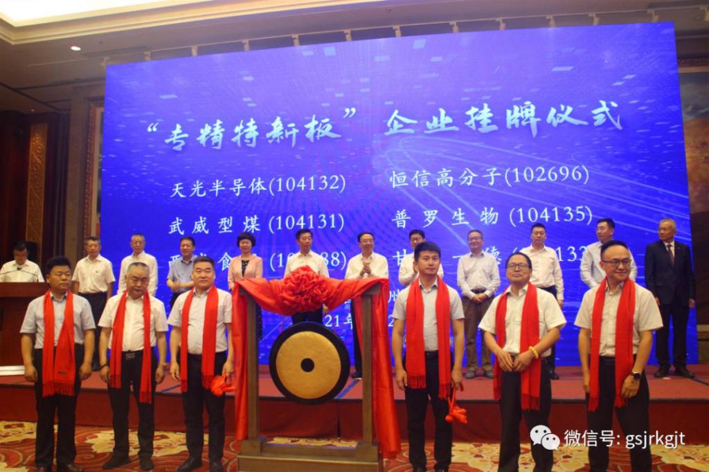 在各位領導的見證下,省法院副院長任建國、省人社廳副廳長何永強、省自然資源廳副廳長王馳分別與金控集團總經理雷鐵簽訂戰略合作協議;首批“專精特新”企業天光半導體、恒信高分子、武威型煤、普羅生物、西域食品、甘肅一德掛牌鳴鑼,成功登陸甘肅股權交易中心“專精特新板”。